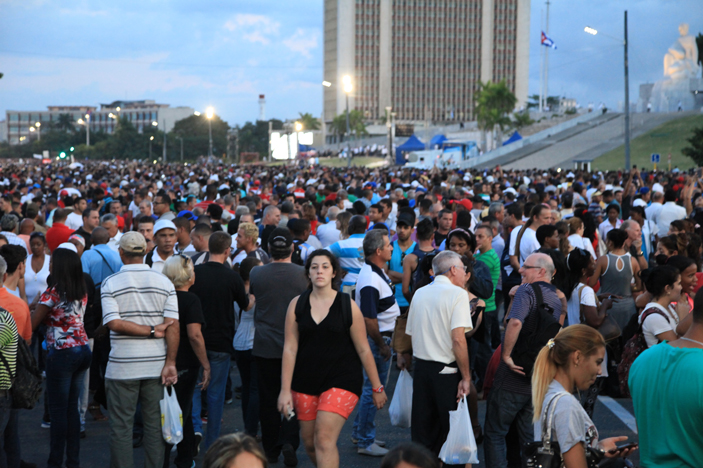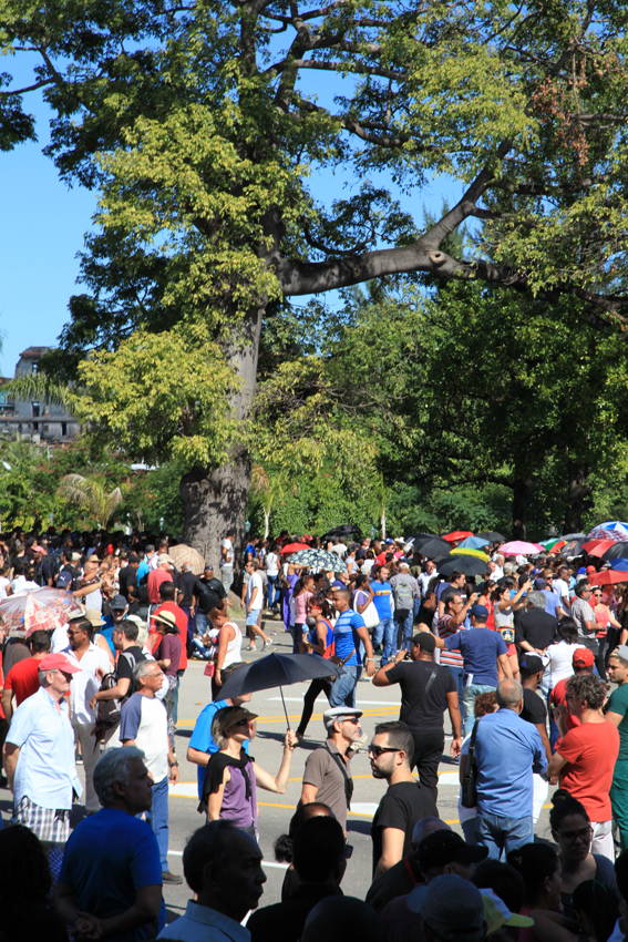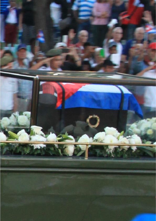 Committees of the Revolution are now plastering official announcements in all the neighbourhoods. I want to buy newspapers. The most official I can find. Can't miss. Actually, there is only two and both are representing the party. Inside the first one Fidel is the historical chief full of quotes from cubans who are saying their devoted love for the past Commandante. A family encounter. It is calling to join La Plaza de La Revolution. 2 days of mourning and the third devoted to the last convoy of his ashes from la Havana to Santiago de Cuba. The next morning, we are joined the column of functionaries from the Ministry of Culture. At 6 am. Before the rest of the population. Each ministry is raising its people to join the Plaza of the Revolution. From the seagull view, they were coming from cardinal points of the city drawing a star in the city's streets. Under a zenithal light I am with Laura and Lorenzo, Michelangelo Pistoletto and Anish Kapoor at the Fidel's Funeral and this is the most normal thing in the world. A five hours queue is leading us inside the basement of the tower. His portrait is surrounded by flowers. People give him the last salute. No ashes, no body. Only a large portrait and flowers. The day is declared national mourning. Everybody is expected information about what the future will look like. But first you have to join the place and say Goodbye A night is comming. A day As a new day. We're coming back home. THE DAYS AFTER THE DEATH OF FIDEL